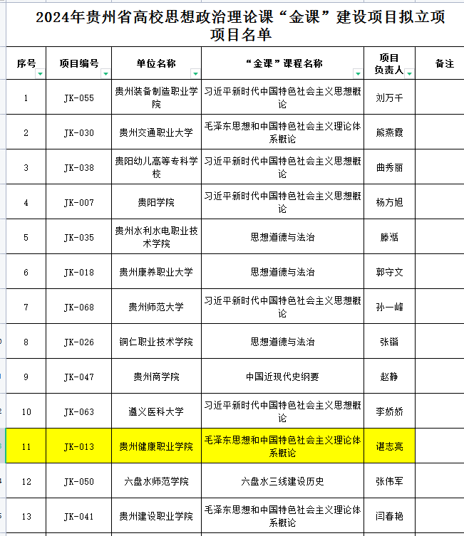 教师谌志亮牵头申报的《毛泽东思想和中国特色社会主义理论体系概论》课程被立项为贵州省思想政治理论课“金课”建设项目。标志着该课程在教学质量、教学内容、教学方法等方面达到了省级领先水平,为我院思政课建设进一步发展和创新提供了有力支撑。