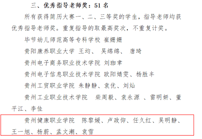 据悉,此次简历设计技能大赛收到33所高职院校共1020份作品,组委会特邀请北京高职院校的专家及贵州省具有高级职称的评审代表组成专业评审团对简历作品进行初审、二审、终审,最终评审一、二、三等奖共36名,并产生相应的优秀指导老师奖。