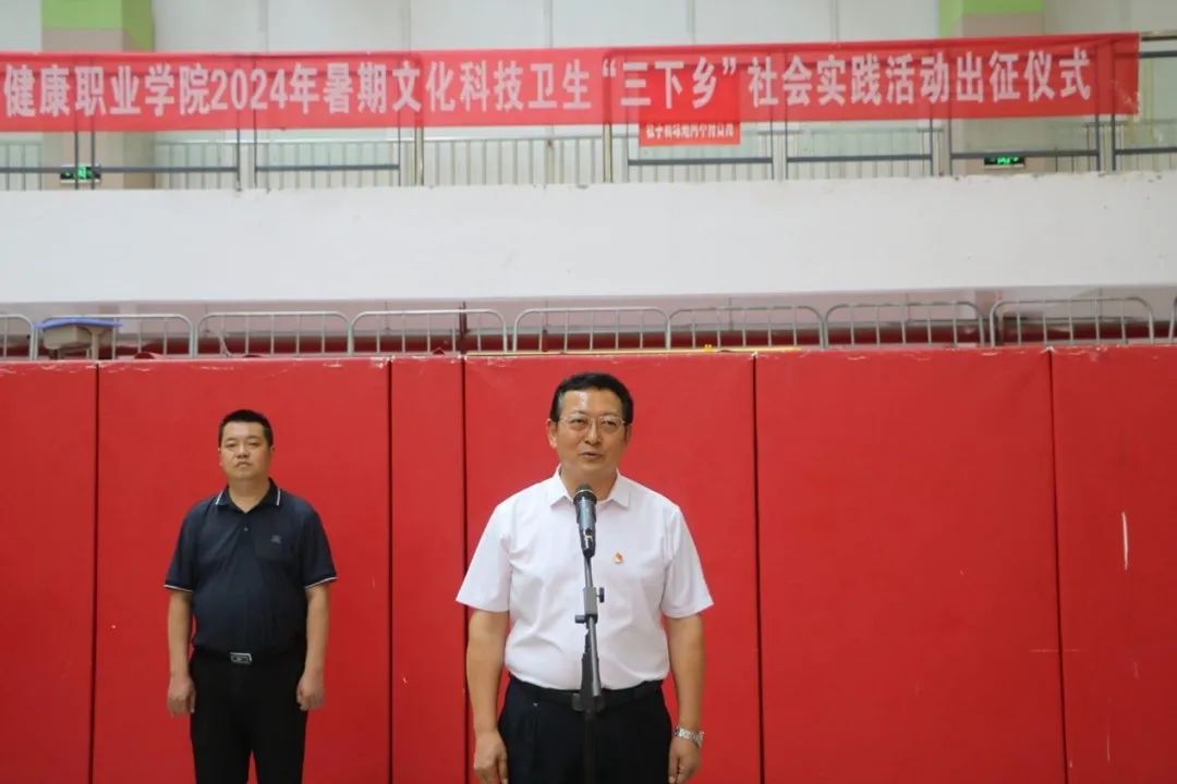 7月1日,我院在体育馆举行2024年暑期“三下乡”社会实践活动出征仪式,院党委副书记李黔军出席并致辞,护理系党总支书记孙健,健康管理系党总支书记胡支江,中医药系党总支书记田松明出席。仪式由团委书记张铭峰主持。