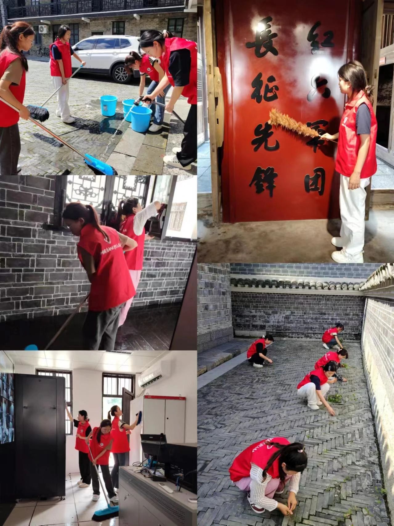 参观完会师纪念馆后,志愿服务队一行来到红三军政治部旧址与纪念馆工作人员召开了简单的座谈会,商谈志愿服务活动的具体细节。座谈会结束以后,在工作人员的引导下,志愿者们对纪念馆和红三军政治部旧址进行了卫生大扫除。志愿者们捡垃圾、扫灰尘、拔杂草···穿着红色马甲的她们,那一抹抹“志愿红”为木黄这片红色圣地勾勒出这个夏天一抹温暖的底色。