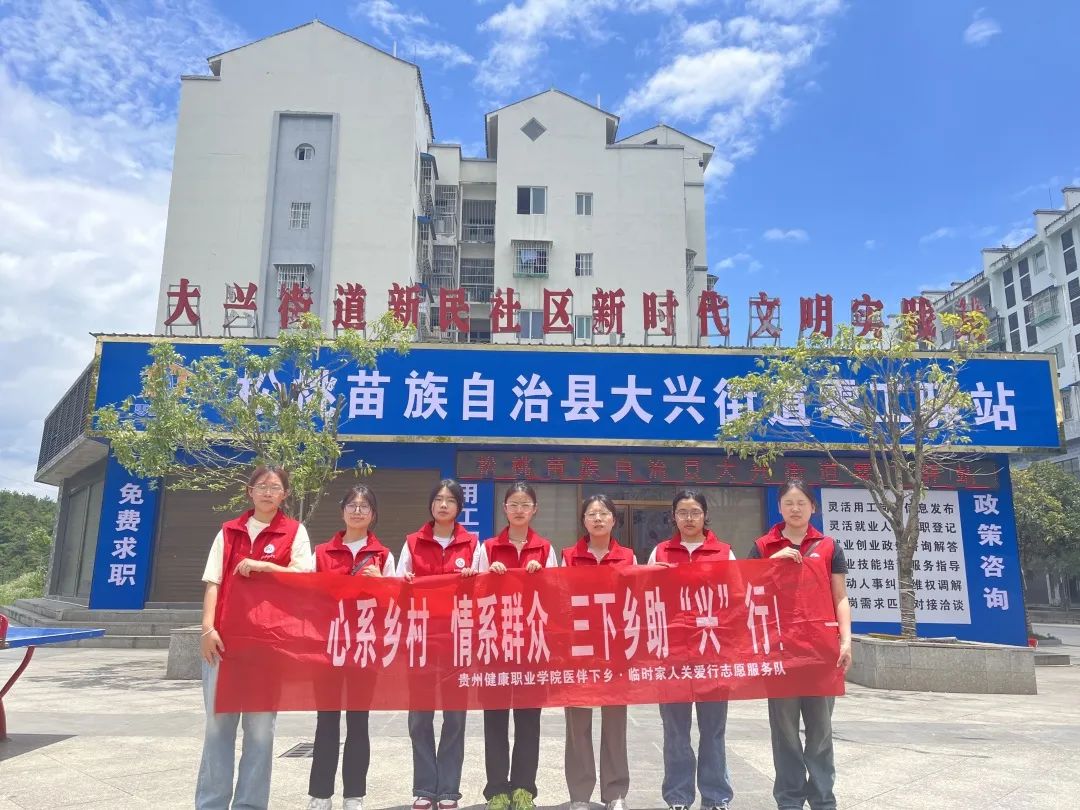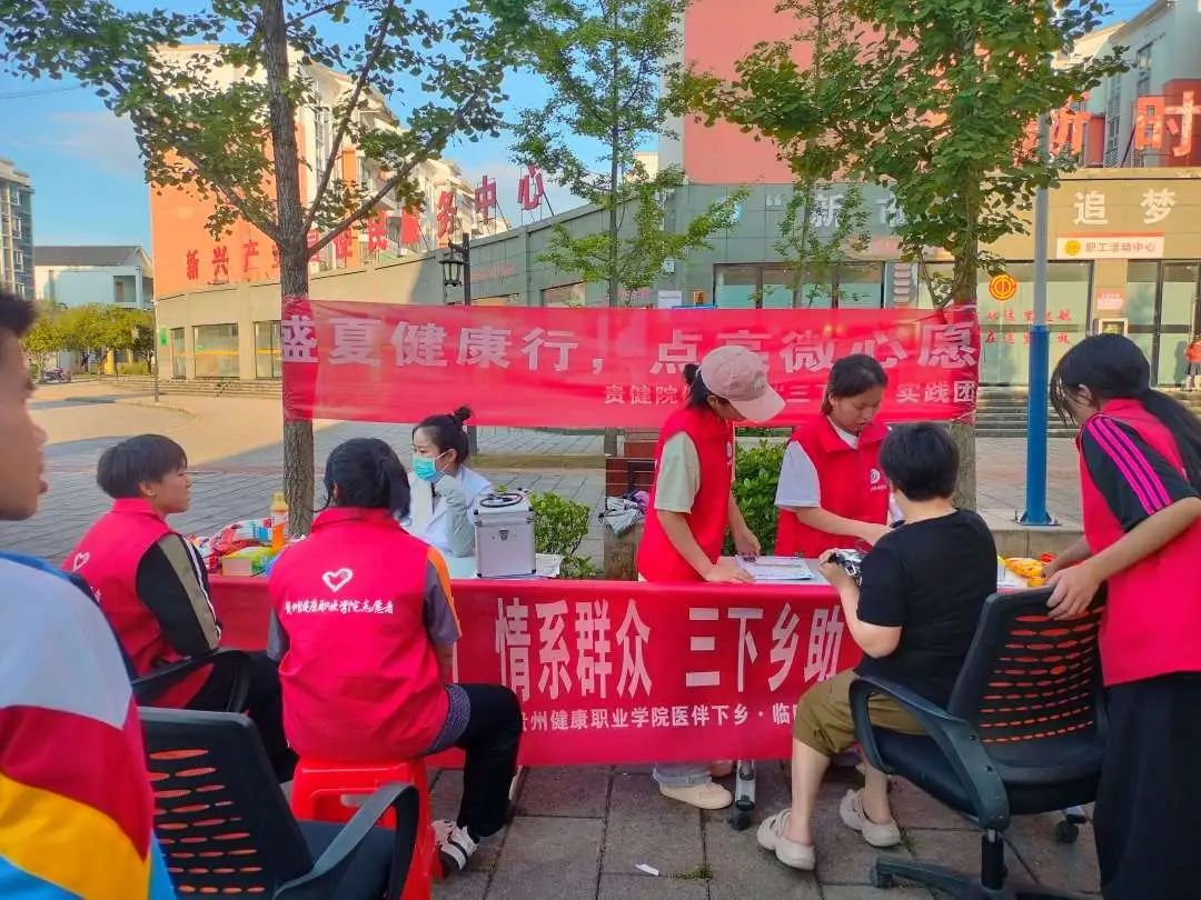 7月3日上午,贵州健康职业学院“医伴下乡—临时家人关爱行”志愿服务队走进大兴街道新民社区,在社区广场开展义诊活动,为社区居民测量血压、血糖,普及健康知识等,用专业的技能和温暖的笑容,为社区居民提供了贴心的医疗服务。