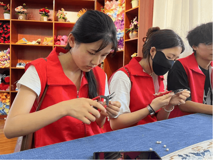 7月2日,贵州健康职业学院同心振乡·健康铜行志愿服务队来到铜仁市万山区旺家花园社区,了解社区的基本情况,参观了旺家手工艺品。社区居民“手把手”耐心教志愿者们基本的手工编织,志愿者们也逐渐投入其中,并取得了一定的成果。