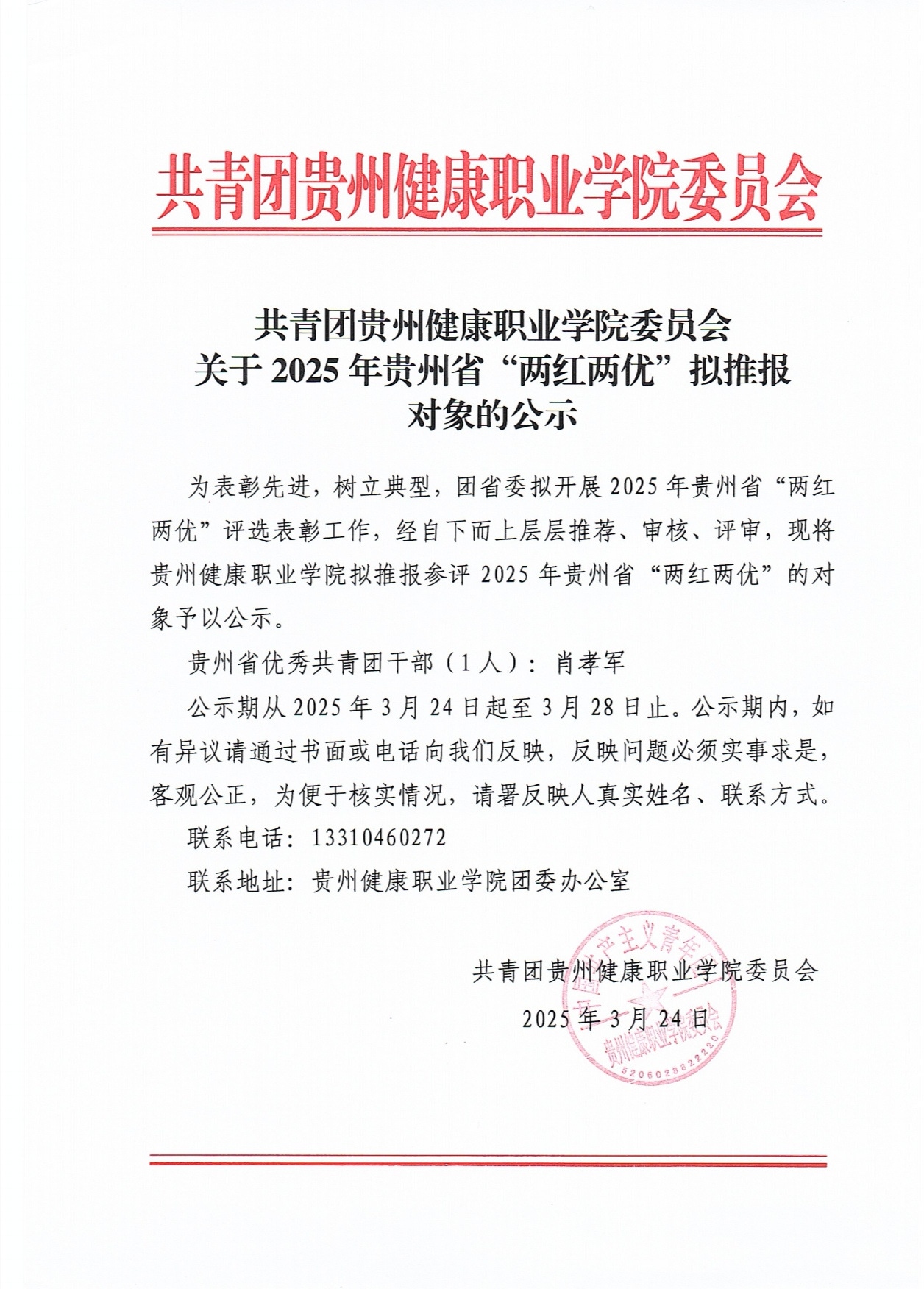 共青团贵州健康职业学院委员会 关于2025年贵州省“两红两优”拟推报 对象的公示