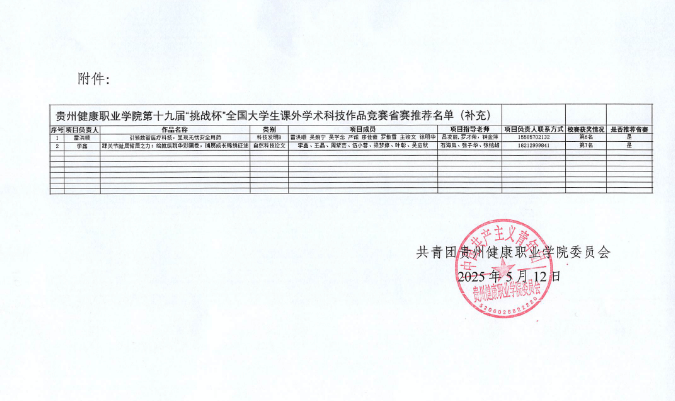根据《贵州健康职业学院关于举办第十九届“挑战杯”全国大学生课外学术科技学术作品竞赛校赛方案》比赛安排,经校团委研究决定,已推荐17件优秀项目报名省赛。现团省委增加省赛指标,其中科技发明B类1项指标,自然科学类学术论文1项指标。根据贵州健康职业学举办十九届“挑战杯”全国大学生课外学术科技学术作品竞赛校赛排名,现将补充省赛推荐名单公示如下: