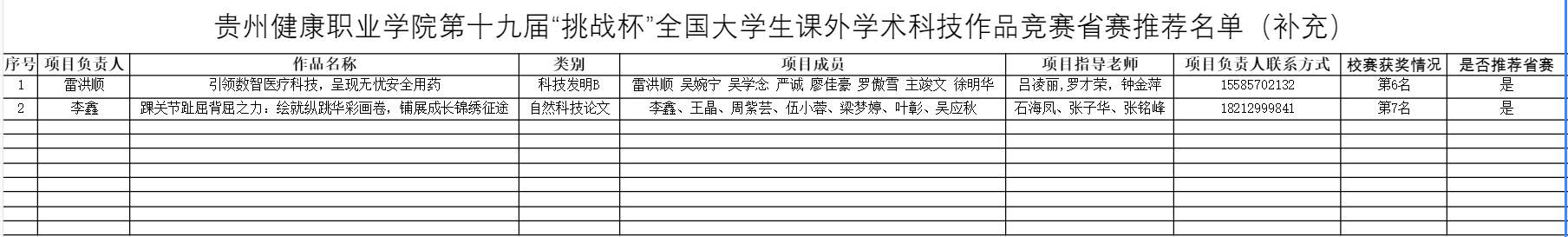 附件:贵州健康职业学院第十九届“挑战杯”全国大学生课外学术科技作品竞赛省赛推荐名单(补充)