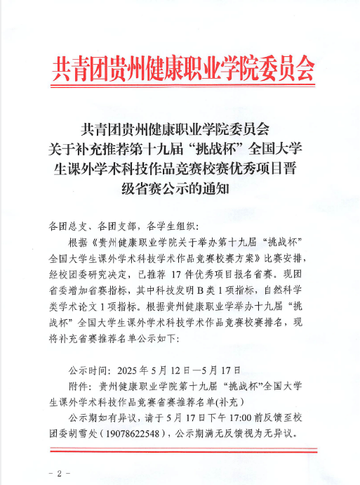 共青团贵州健康职业学院委员会 关于补充推荐第十九届“挑战杯”全国大学生课外学术科技作品竞赛校赛优秀项目晋级省赛公示的通知