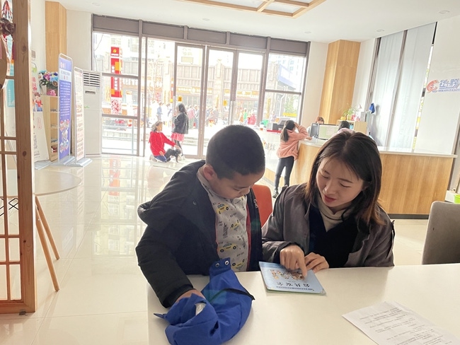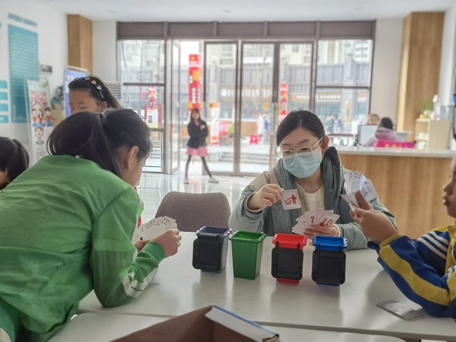 “孩子们,你们知道废纸、塑料瓶应该分到那个垃圾桶呀?”“放入回收垃圾桶内。”在这样一问一答之中,开始了一天的陪伴活动。活动分为两个阶段,老师们首先带着孩子们在室内识字、下棋、玩垃圾分类等游戏,孩子们认真学习,积极参与。