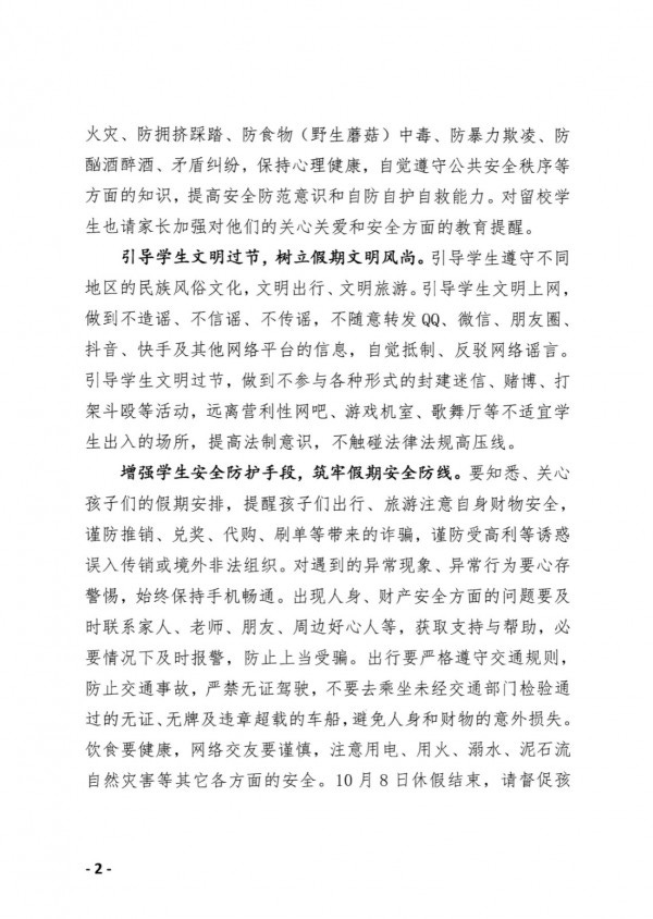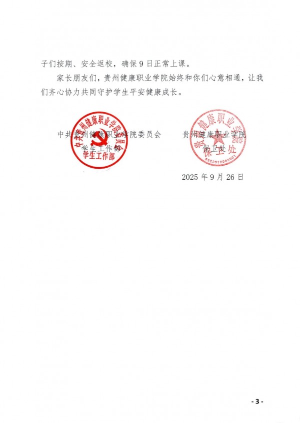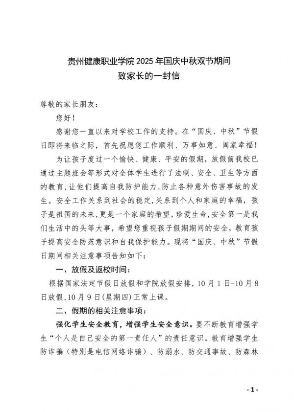 贵州健康职业学院2025年国庆中秋双节期间致家长的一封信