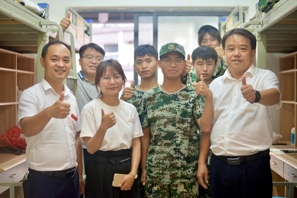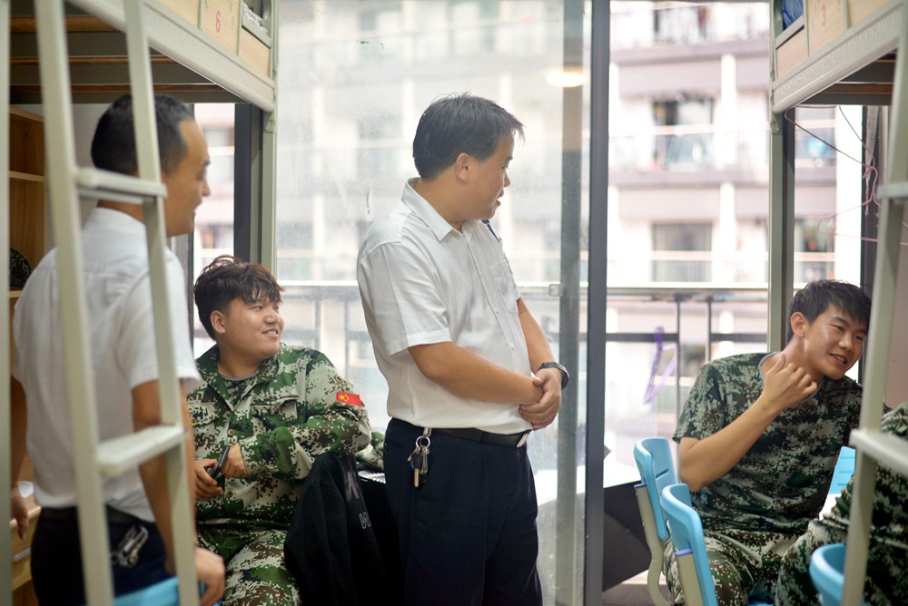 “同学们好,我们来看看大家”“家住哪里?”“食堂饭菜还吃得惯吗?”“住宿条件还满意吗?”“军训第一天感觉怎么样?”走进2021级新生B4栋寝室,田松明、周斌亲切地与同学们打招呼并详细询问校园生活和军训训练情况,叮嘱同学们要团结友爱、互帮互助,共同营造安全、卫生、整洁的宿舍环境。领导们的问候和关怀,逐渐消除了同学们对新环境的陌生与不适,离开时同学们热情地邀请老师们一起合影留恋。