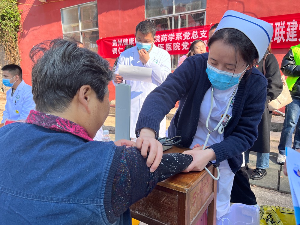 会后,全体党员联合铜仁宏昕康新中医医院党支部前往桂花塘社区,开展健康义诊志愿服务活动。前来问诊、检查的群众络绎不绝,义诊医疗队的医生们认真为患者测血压、血糖,诊疗疾病,并耐心解答群众提出的关于常见病、多发病的预防和诊治等问题。支部党员同志发放健康宣传资料,讲解合理饮食、安全用药、防寒保暖等健康知识。