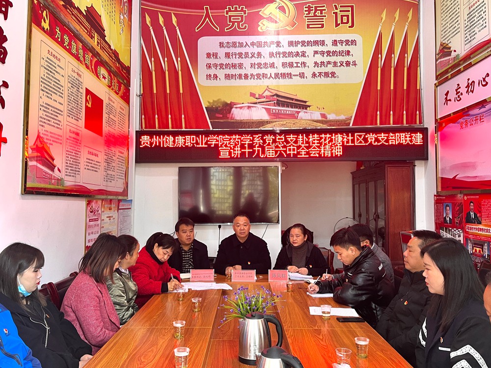12月3日,贵州健康职业学院药学系党总支深入桂花塘社区联建党支部宣讲党的十九届六中全会精神,学院党委委员、工会主席王锡林出席会议并作宣讲,联建支部全体党员、预备党员和入党积极分子参加会议。