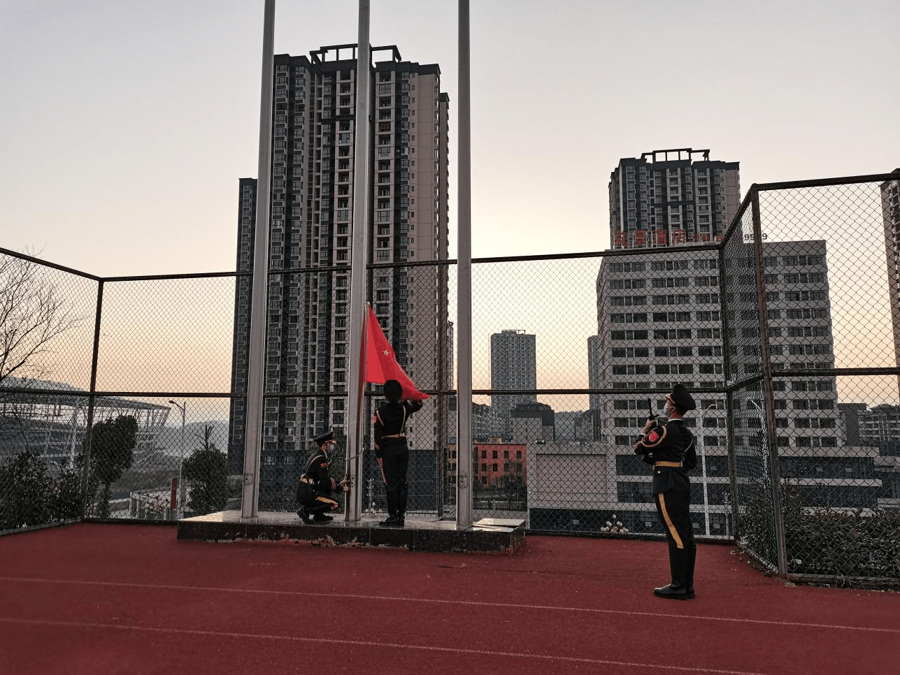 上午7:00点整,伴随着庄严的国歌声,升旗手扬起国旗、摇起手柄,五星红旗冉冉升起,全体师生心怀崇敬,目光坚毅,注视国旗,直至五星红旗在空中随风飘扬。
