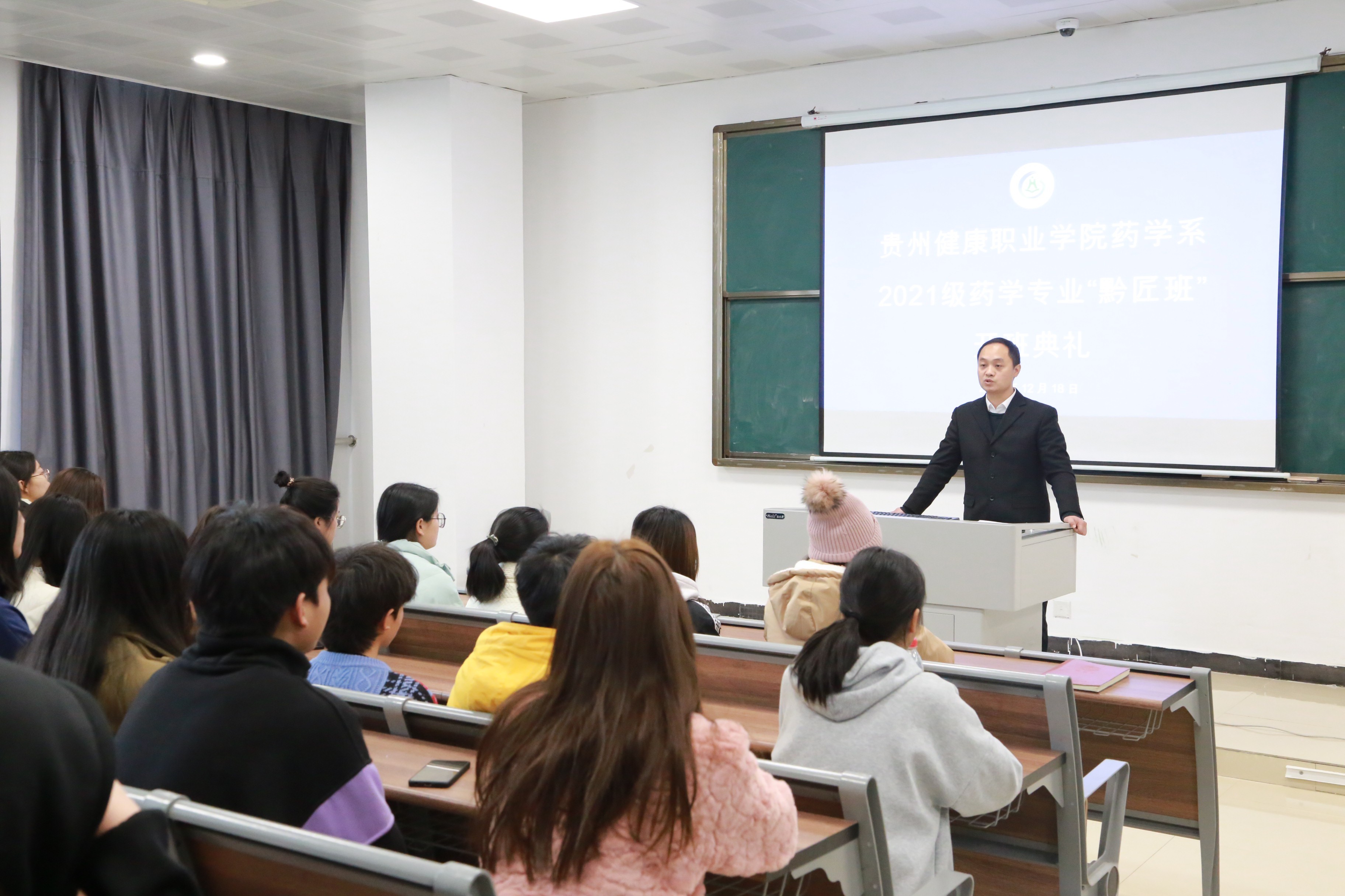 为深入学习贯彻十九届六中全会精神,扎实推进职业教育高质量发展,2021年12月18日,药学系2021级药学专业“黔匠班”在9-10-400教室举行开班典礼!“黔匠班”副班主任孟文潮主持,药学系党总支书记田松明,党总支副书记、系主任,“黔匠班”班主任周斌参加典礼并讲话。