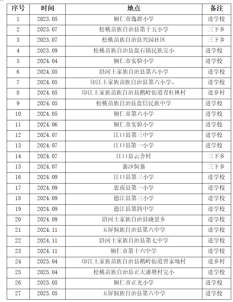 2.开展进社区、进校园、进乡村、进机关、进企业等“走出去”科普活动情况。基地依托科普队伍建设,结合学院大学生“三下乡”活动开展,深入碧江区、松桃苗族自治县、沿河土家族自治县、印江土家族苗族自治县等铜仁市管辖范围内十余个区县与市科协联合开展民族医药文化进社区、进校园、进乡村等系列活动30余次,活动累计覆盖18000余人次。