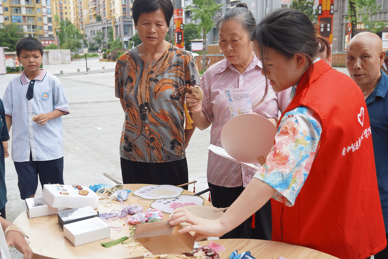 在社区课后服务中心,志愿者们为小学生辅导作业,讲述民族团结小故事,教授卫生知识,并科普中医药非遗知识。赠送的中医药科普学习本和中药香囊,让孩子们在趣味中感受民族医药智慧。下午,在社区广场举办本草微型文化展。志愿者们展示艾草(寓意驱邪避秽)、菖蒲(寓意防疫)等铜仁本地常见、安全且寓意美好的植物,讲解其在本地各民族传统文化中的象征意义、健康价值以及相关中药文创产品,让居民了解民族医药文化的独特魅力。