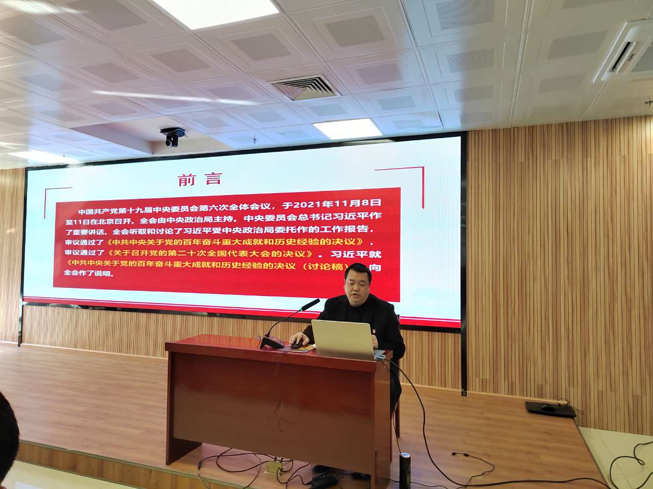 宣讲会上,胡支江首先领学了党的十九届六中全会公报,他从一个根本问题、两个决议和确立、三次飞跃和三个需要、四个历史阶段和四个庄严宣告、十大宝贵历史经验等方面对公报的主要内容进行了梳理解读。随后,从“党的十九届六中全会概况、重大意义、全面贯彻落实党的十九届六中全会精神”几个方面进行宣讲。