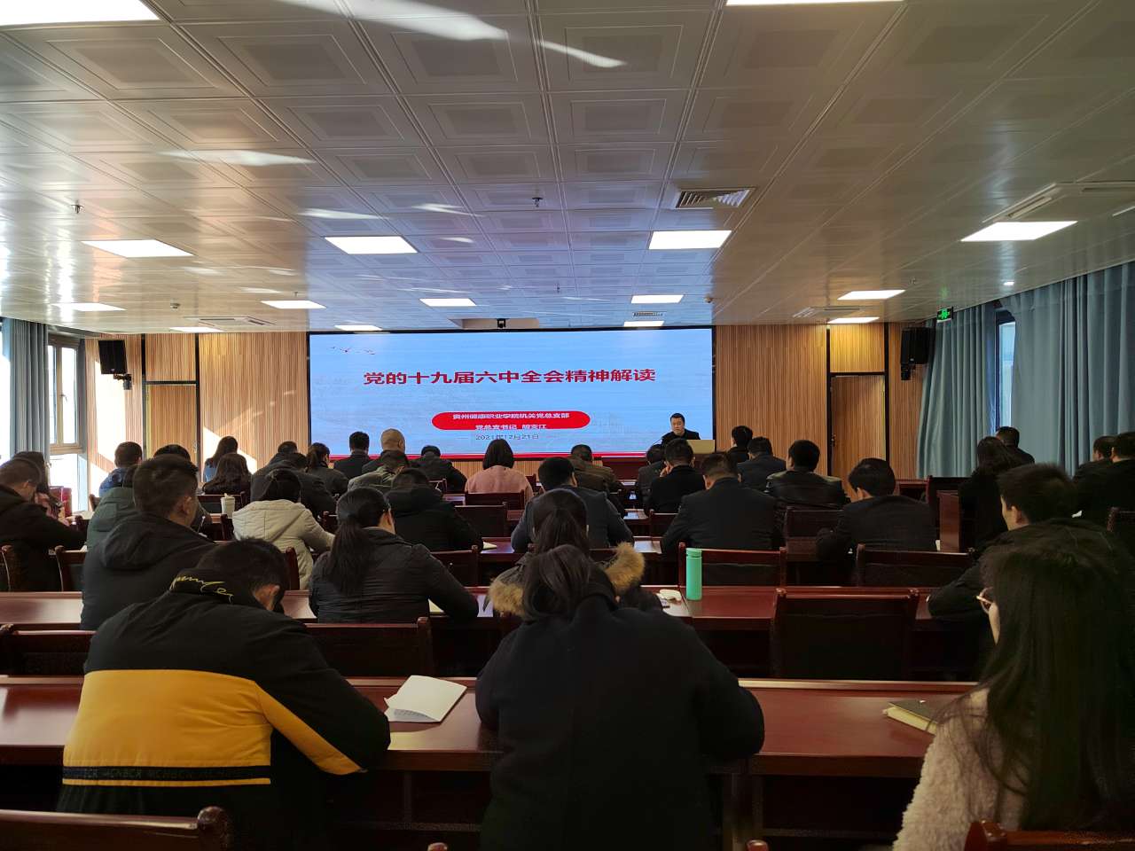 12月21日,学院机关党总支在行政楼一楼视频会议室深入学习贯彻党的十九届六中全会精神,机关党总支书记、教学质量监控与评估办公室副主任胡支江作宣讲报告,机关第一、第二、第三、第四支部共60余名党员参加宣讲会。