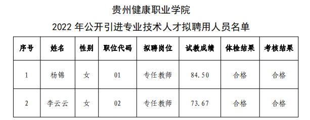 根据《贵州健康职业学院2022年公开引进专业技术人才实施方案》《贵州健康职业学院2022年公开引进专业技术人才考试方案》《贵州健康职业学院2022年公开引进专业技术人才考试公告》规定,经资格审查、面试、体检和政审考察,杨锦、李云云2位同志符合聘用条件,现进行公示,基本情况如下: