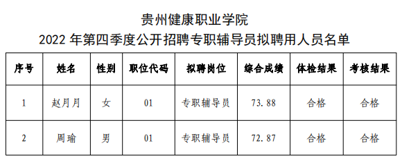 根据《贵州健康职业学院2022年第四季度公开招聘专职辅导员实施方案》安排,经资格审查、面试、体检和政审考察,赵月月、周瑜2位同志符合聘用条件,现进行公示,基本情况如下: