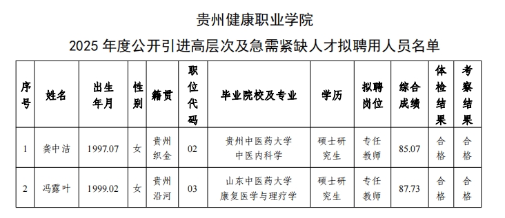 贵州健康职业学院2025年度公开引进高层次及急需紧缺人才拟聘用人员公示